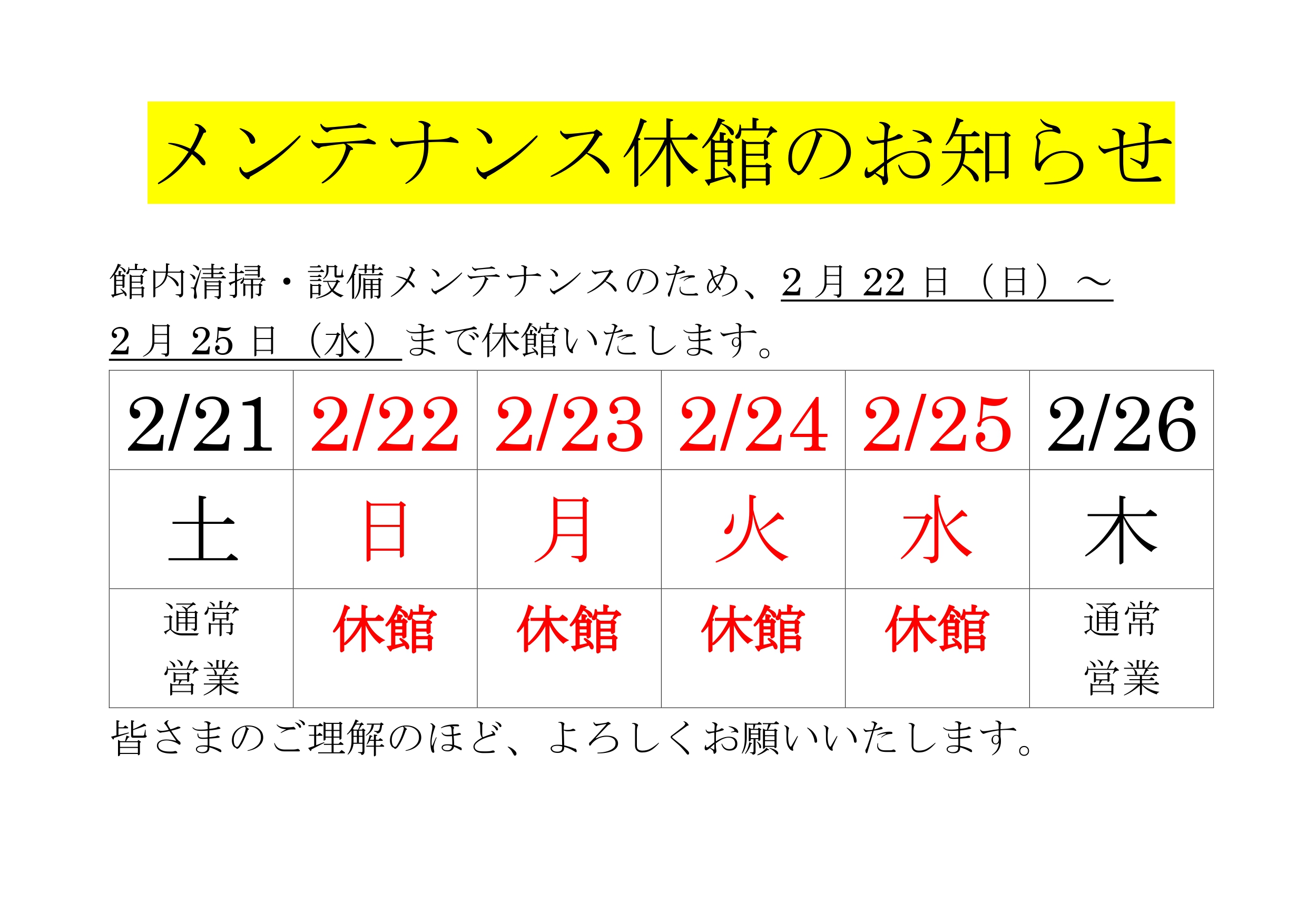 【令和8年2月22日(日)~2日25日(水) メンテナンス休館のお知らせ】